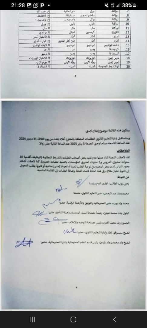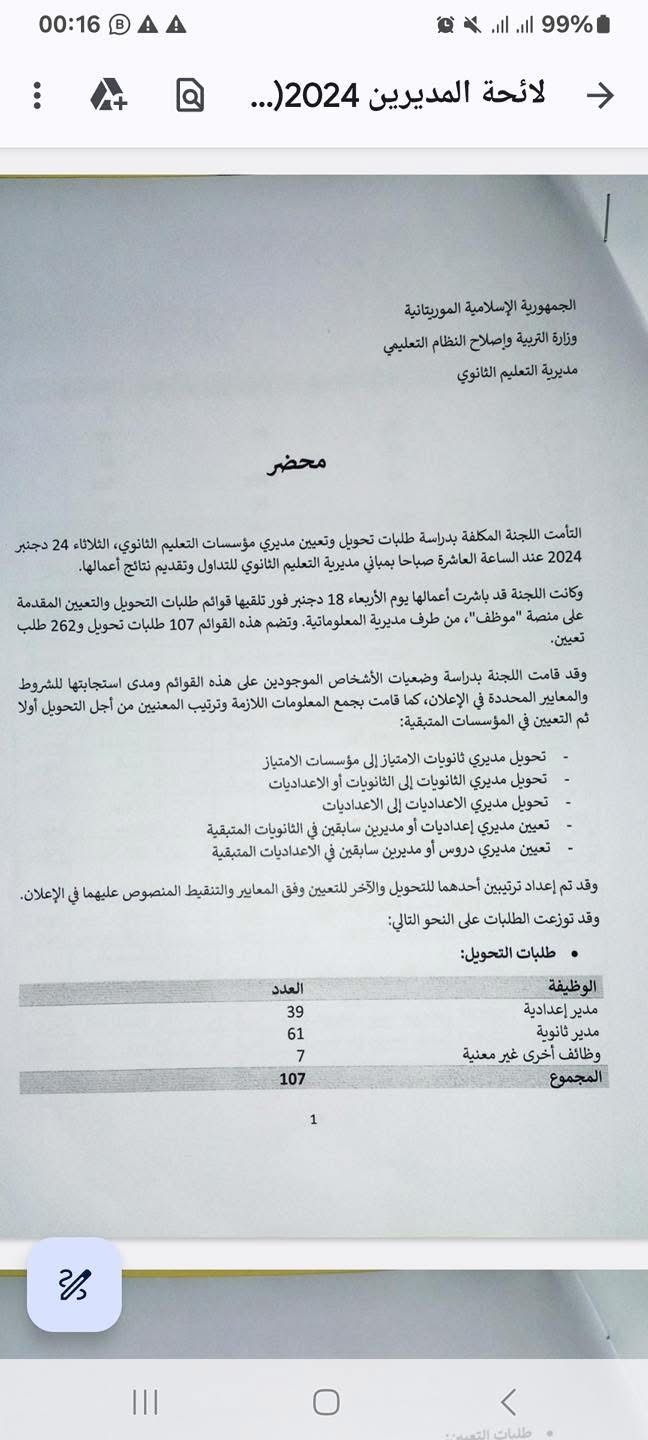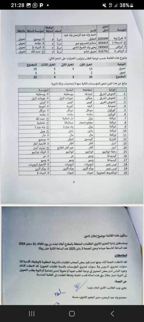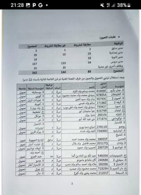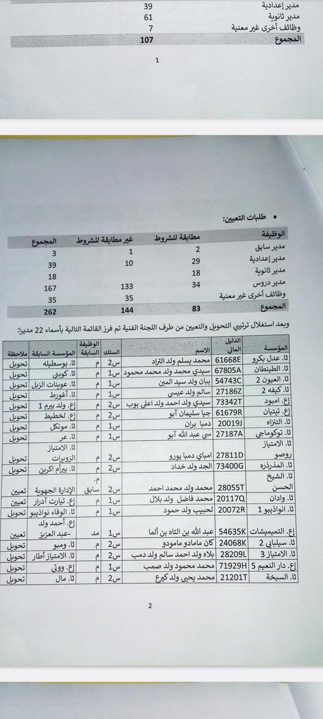 وحسب محضر صادر عن اللجنة فقد تم تحويل وتعيين 22 مديرا لمؤسسات بعضها في نواكشوط، والبعض الآخر في مناطق متفرقة من الداخل، وذلك وفقا للشروط المطروحة أصلا.
