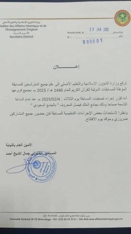 أعلنت وزارة الشؤون الإسلامية والتعليم الأصلي أنها حددت موعد التصفيات للمترشحين للمسابقة المؤهلة للمسابقات الدولية للقرآن الكريم للعام 1446 ه /2025 م .