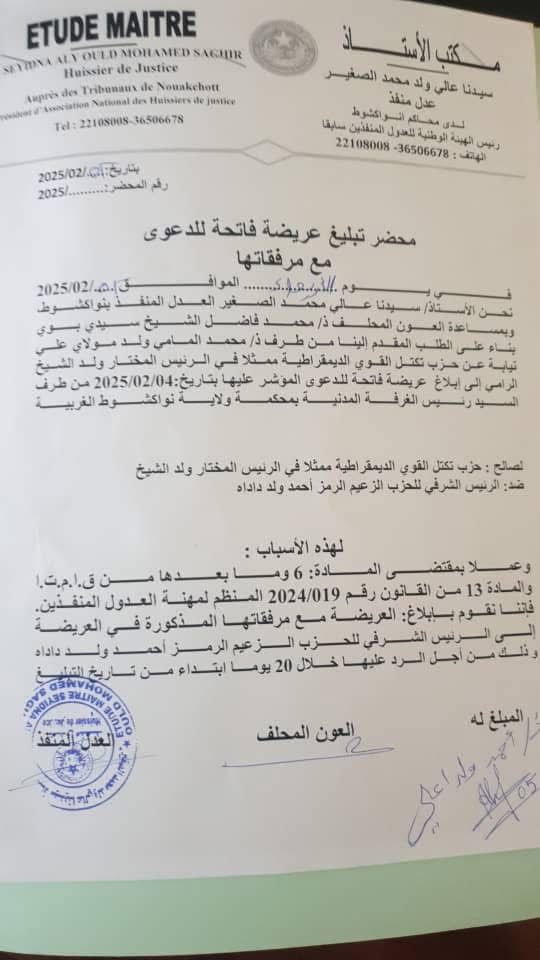 وقد أصدر مكتب العدل المنفذ سيدنا علي ولد محمد الصغير محضر تبليغ بالعريضة يوم 2 فبراير 2025.