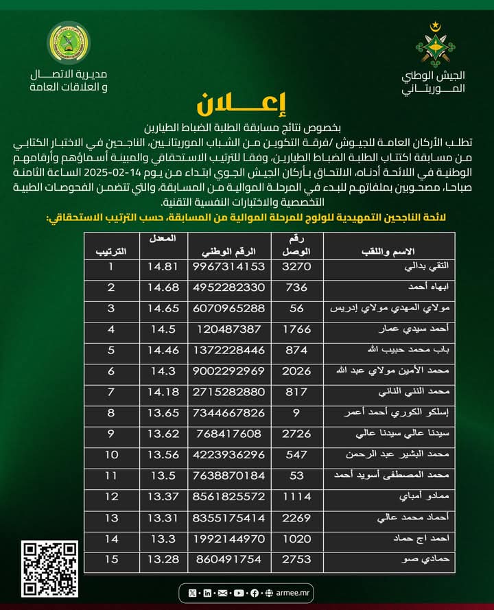 وفقا للترتيب الاستحقاقي والمبينة أسماؤهم وأرقامهم الوطنية في اللائحة أدناه، الالتحاق بأركان الجيش الجوي ابتداء من يوم 14-02-2015 الساعة الثامنة صباحا، مصحوبين بملفاتهم للبدء في المرحلة الموالية من المسابقة، والتي تتضمن الفحوصات الطبية التخصصية والاختبارات النفسية التقنية.