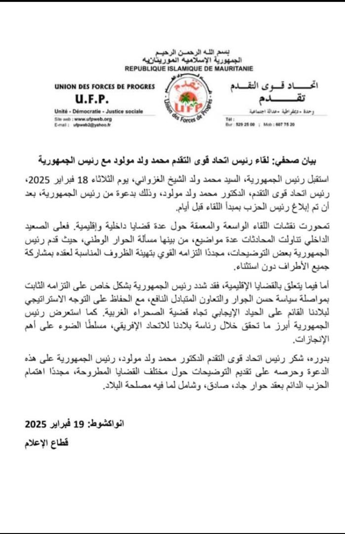 استقبل رئيس الجمهورية، السيد محمد ولد الشيخ الغزواني، يوم الثلاثاء 18 فبراير 2025، رئيس اتحاد قوى التقدم، الدكتور محمد ولد مولود، وذلك بدعوة من رئيس الجمهورية، بعد أن تم إبلاغ رئيس الحزب مبدئياً باللقاء قبل أيام.