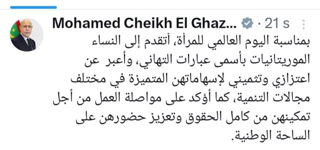 جاء حديث الرئيس غزواني في تغريدة على منصة "X” بمناسبة اليوم العالمي للمرأة، عبر من خلالها عن "أسمى عبارات التهاني" للنساء الموريتانيات.