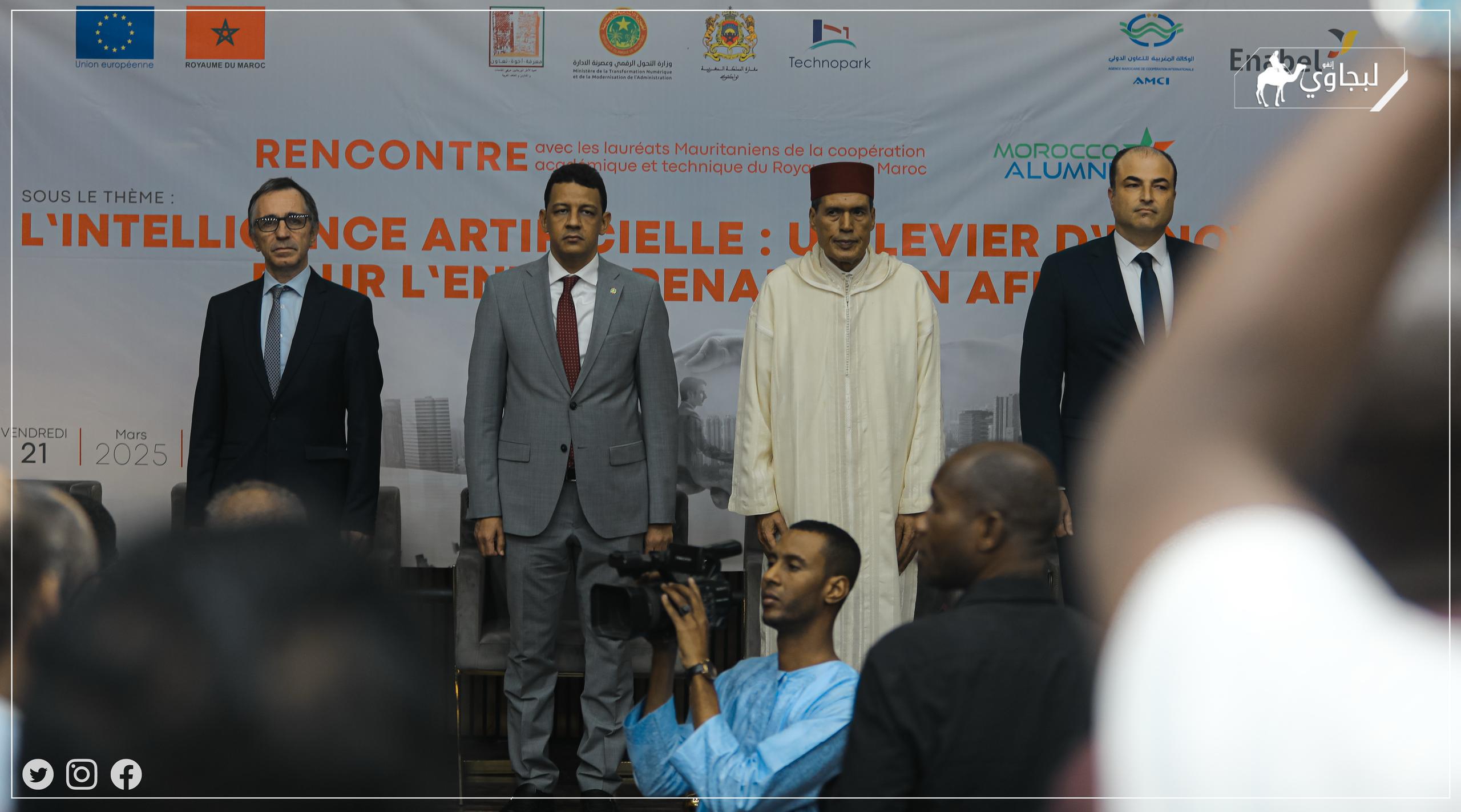 ولا يَفوتُني هنا التنويه بالجهود التي تقوم بها الجمهورية الإسلامية الموريتانية الشقيقة في مجال الرقمنة والذكاء الاصطناعي وخاصة الاستراتيجية الوطنية للذكاء الاصطناعي 2025-2029، التي تُعتبر مقاربة شاملة لا من حيث تشخيص الوضع الحالي ولا من حيث تَوَجُّهاتها وأَولوياتهاالاستراتيجية ولا من حيث حكامتها وأهدافها وركائزها. وما تأسيس الوكالة الرقمية للدولة إلا تجسيد لتنزيل هذه الإستراتيجية التي يسهر على تنفيذها بكل احترافية ومهنية الأخ العزيز معالي وزير التحول الرقمي وعصرنة الإدارة بمساعدة ثلة من الأطر والخبراء الأكفاء، (الحاضرين معنا والذين أوجه لهم التحية من هذا المنبر) وذلك لما تلعبه هذه الإستراتيجية من دور مهم في تطوير الخَدَمات الإلكترونية وتعزيز البِنْية التحتية التكنولوجية وتعزيز المقاولات الناشئة في مجال الرَّقْمِيَّات والذكاء الاصطناعي.
