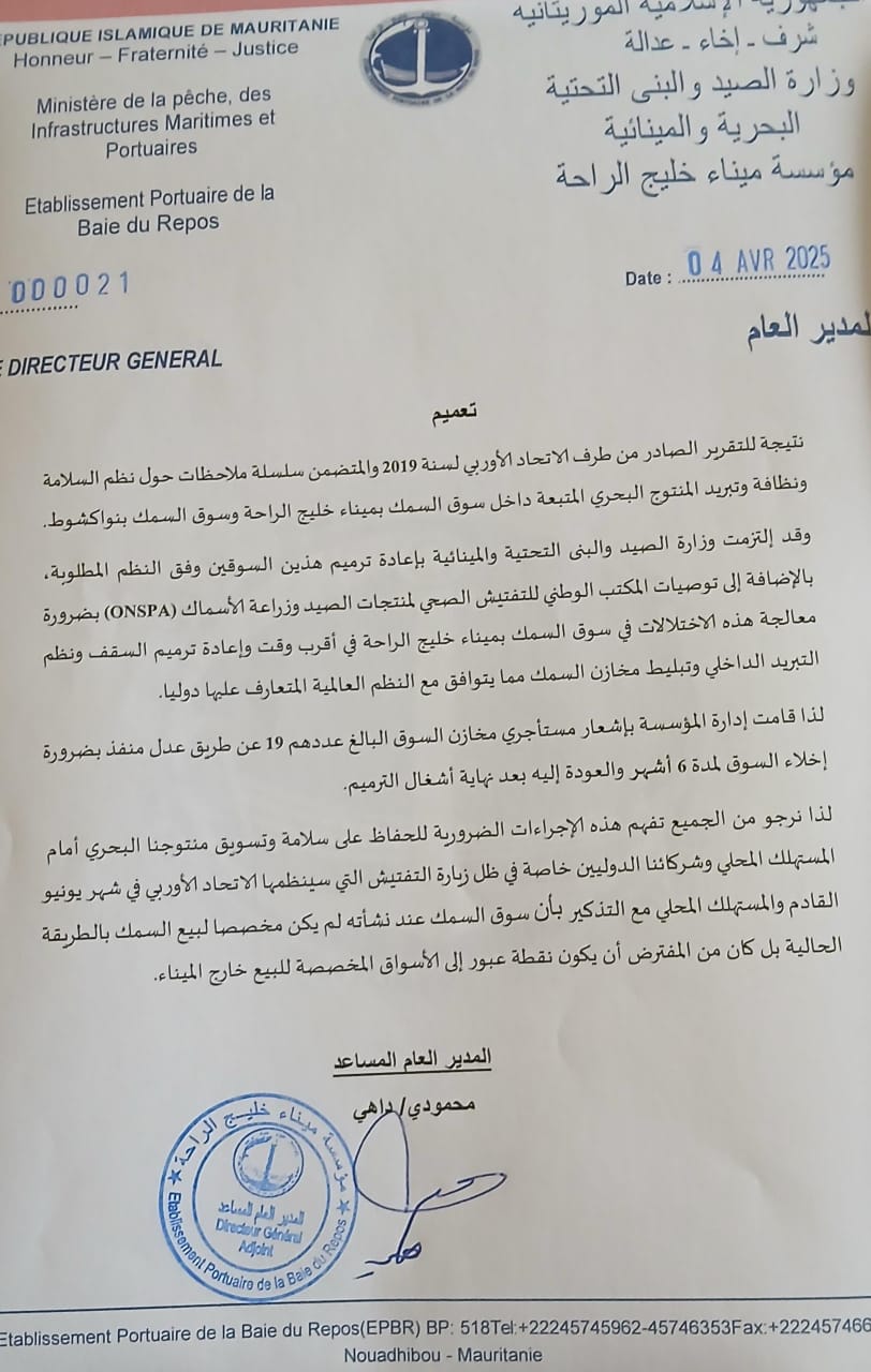 من جهته قال المدير العام المساعد لميناء خليج الراحة محمودي داهي إن قرار إخلاء السوق "ضروري للحفاظ على سلامة وتسويق المنتوج البحري أمام المستهلك المحلي والشركاء الدوليين خاصة في ظل زيارة التفتيش التي سينظمها الاتحاد الأوربي في يونيو القادم".