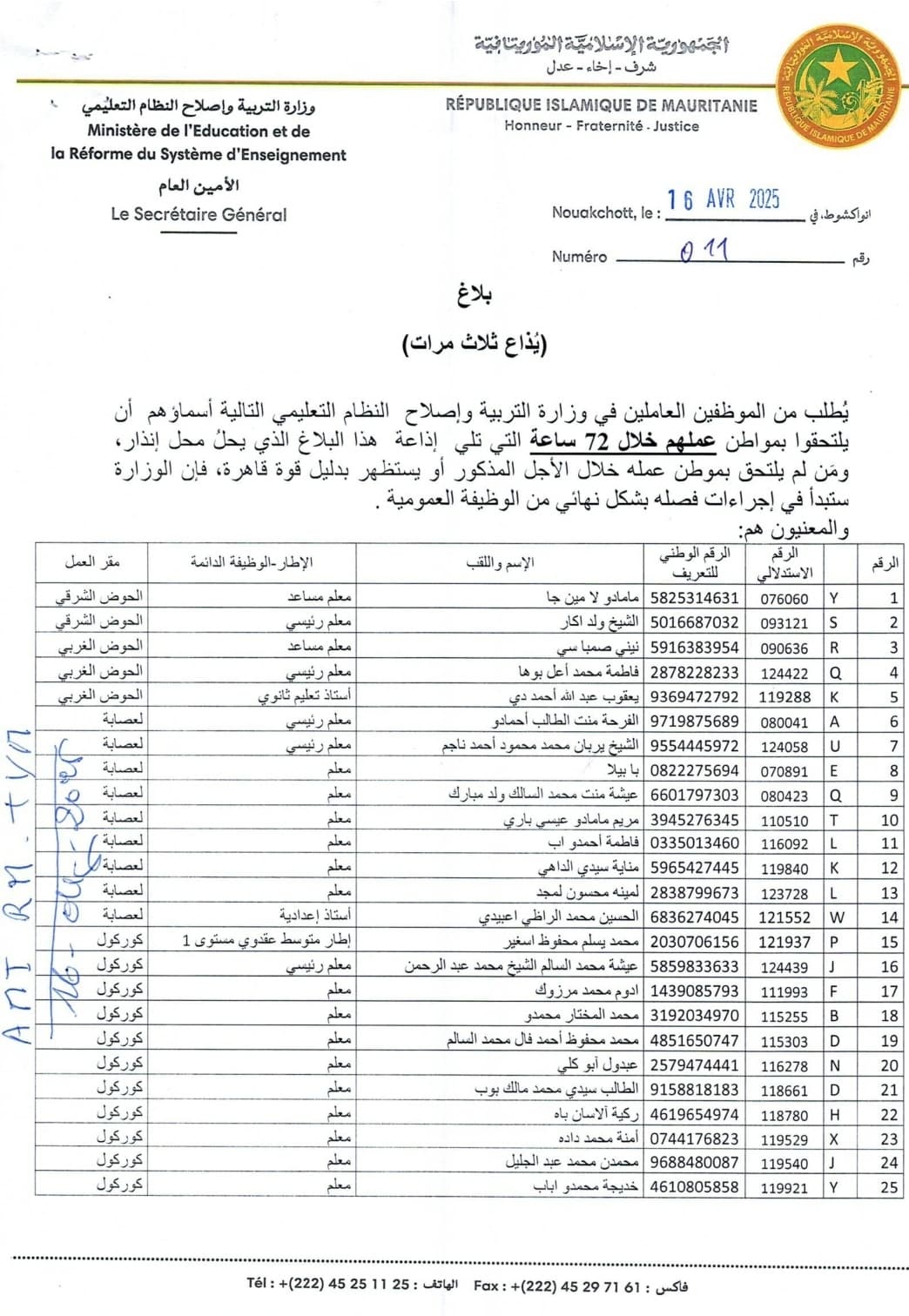أصدرت وزارة التربية وإصلاح النظام التعليمي بلاغا وجهت من خلاله إنذارا بالفصل النهائي من الوظيفة لـ61 من عمالها، إذا لم يحضروا لأماكن عملهم في ظرف 72 ساعة.
