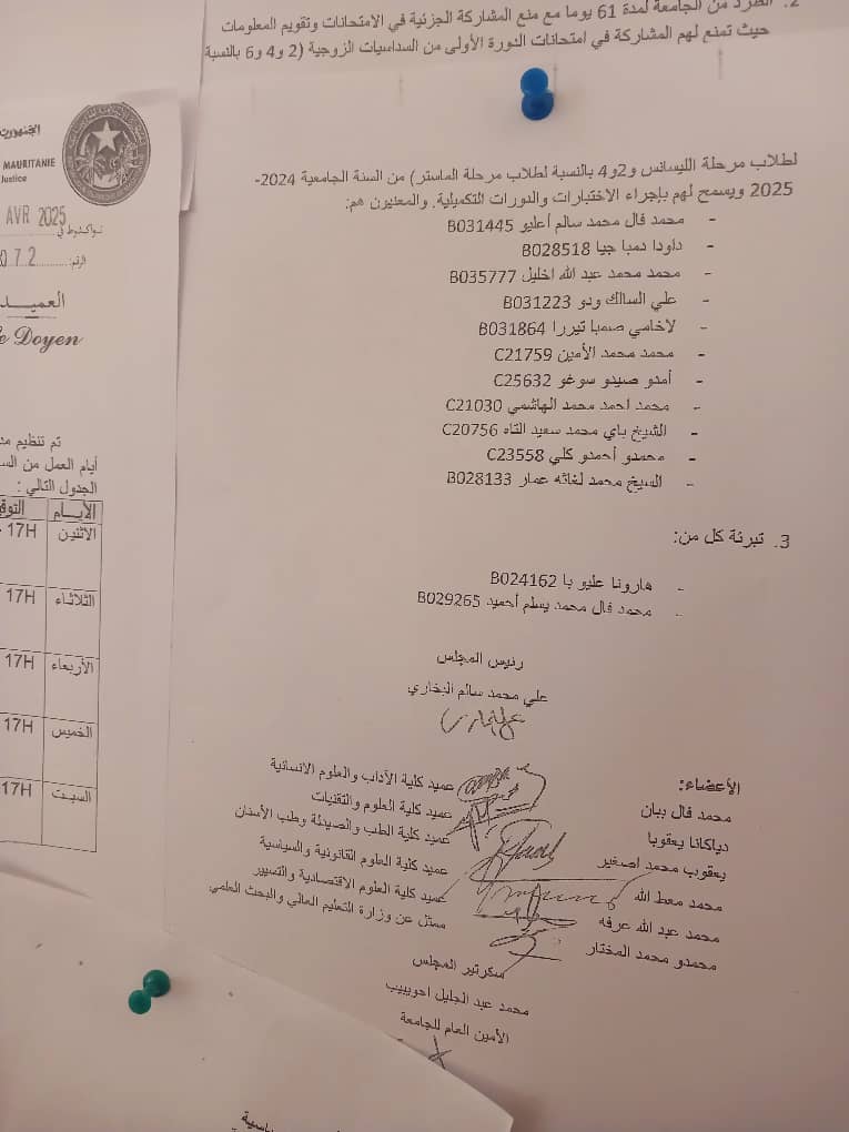 أقر المجلس التأديبي بجامعة نواكشوط طرد 14 طالبا بشكل مؤقت، على خلفية مشاركتهم في أحداث شغب شهدتها الجامعة مؤخرا، شملت أعمال عنف، إتلاف ممتلكات، تعطيل الدروس، واقتحام الكليات لتنظيم أنشطة غير مرخصة، إضافة إلى الاعتداء على حراس الجامعة.