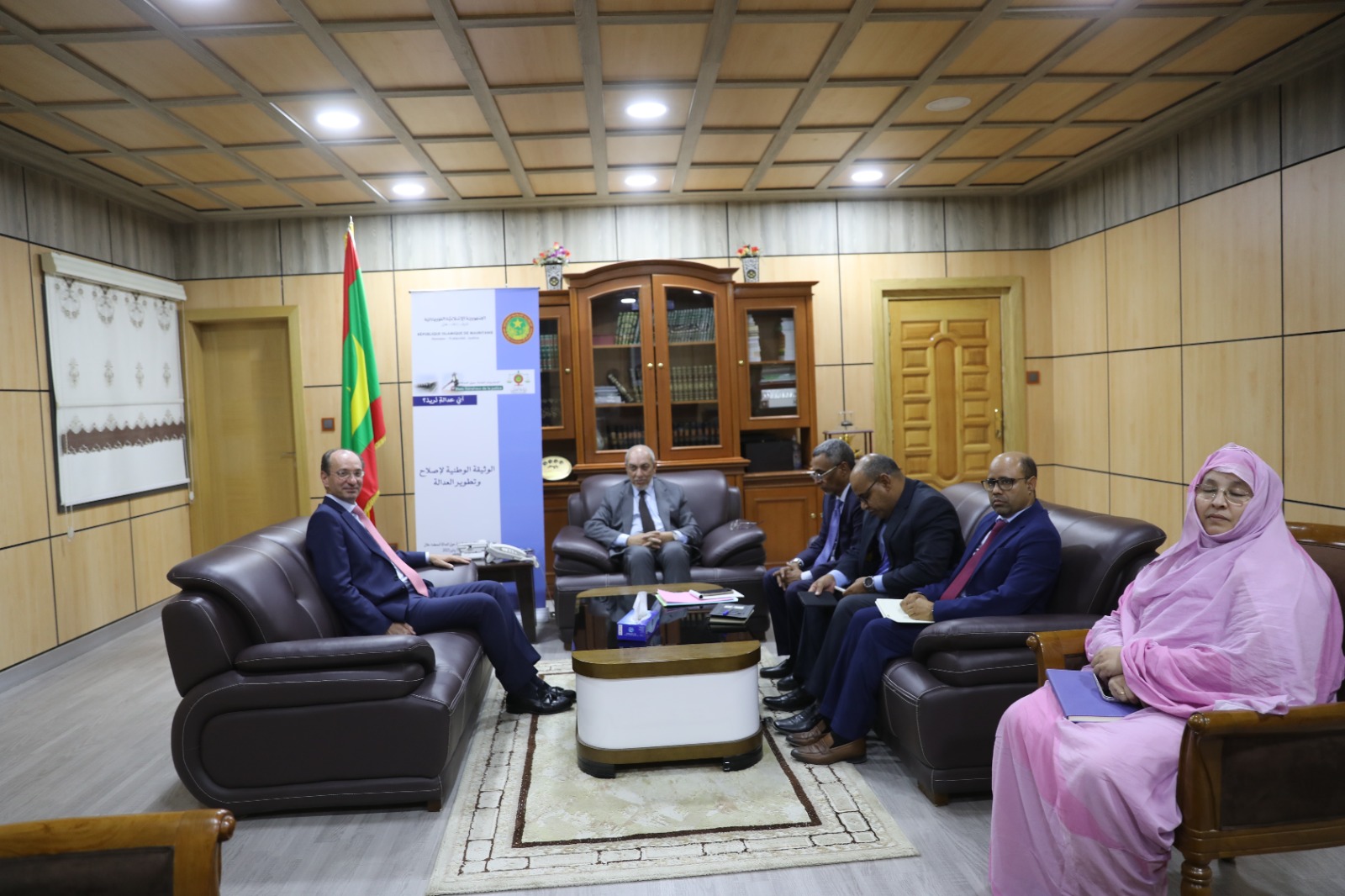 حضر اللقاء إلى جانب معالي الوزير كل من: الأمين العام للوزارة السيد: محمد أحمد عيده، والمستشار المكلف بالتعاون السيد: أعمر القاسم، والمستشارة المكلفة بالاتصال والولوج للعدالة السيدة: منت أحميد بنت التكرور، ومدير التعاون والتعاون القضائي البيني السيد: الحسين الشيخ كبادي.