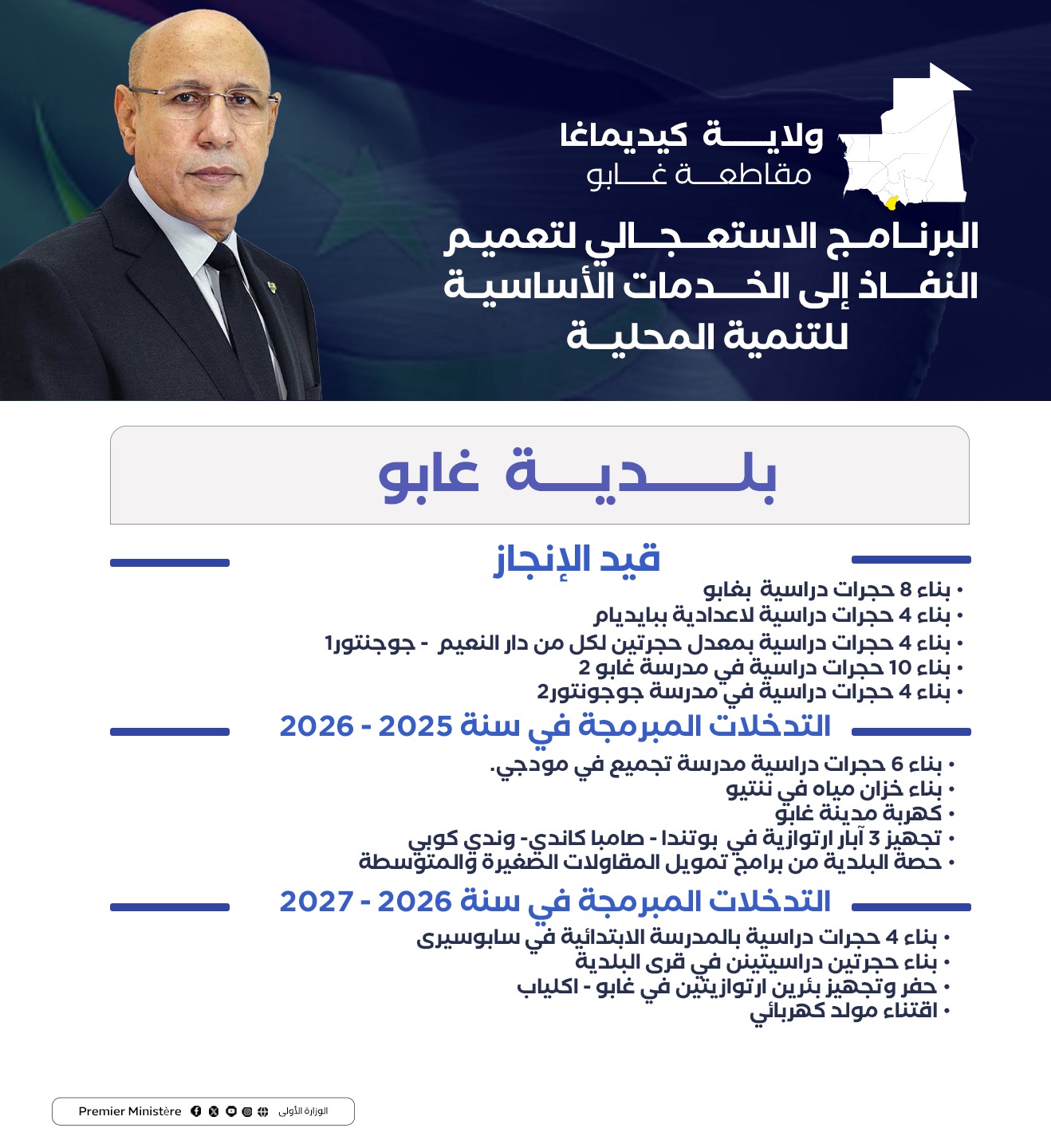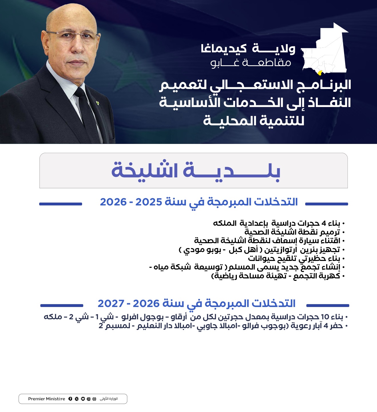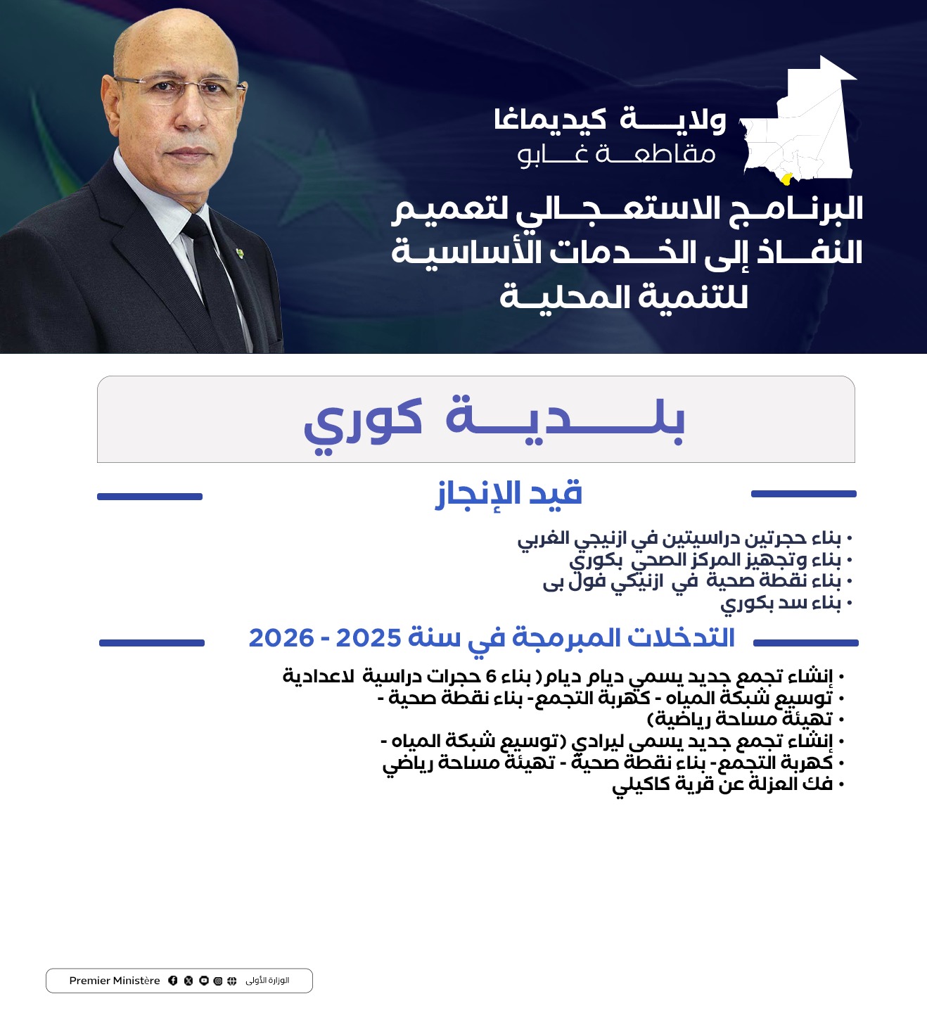 استعرضت البعثة الوزارية إلى ولاية كيديماغا برئاسة المندوب العام للتضامن الوطني ومكافحة الاقصاء “تآزر” السيد الشيخ ولد بده، في اجتماع الأحد بمدينة سيلبابي، التدخلات التي تم اعتمادها في الولاية ضمن البرنامج الاستعجالي لتعميم النفاذ إلى الخدمات الضرورية للتنمية المحلية، بناء على النقاشات التي جرت في المنتديات الجهوية للتخطيط التنموي التشاركي في شهر يناير الماضي.