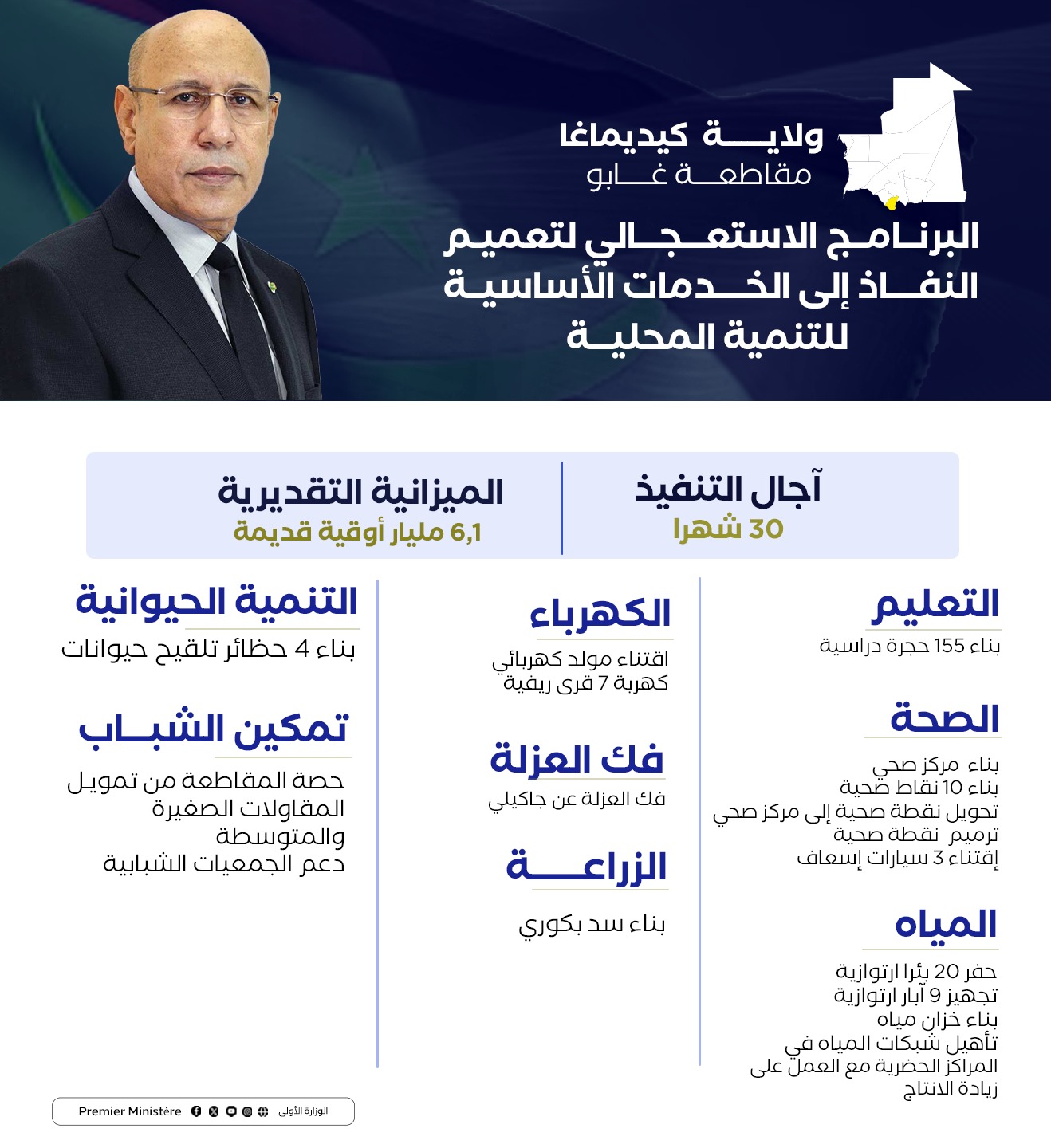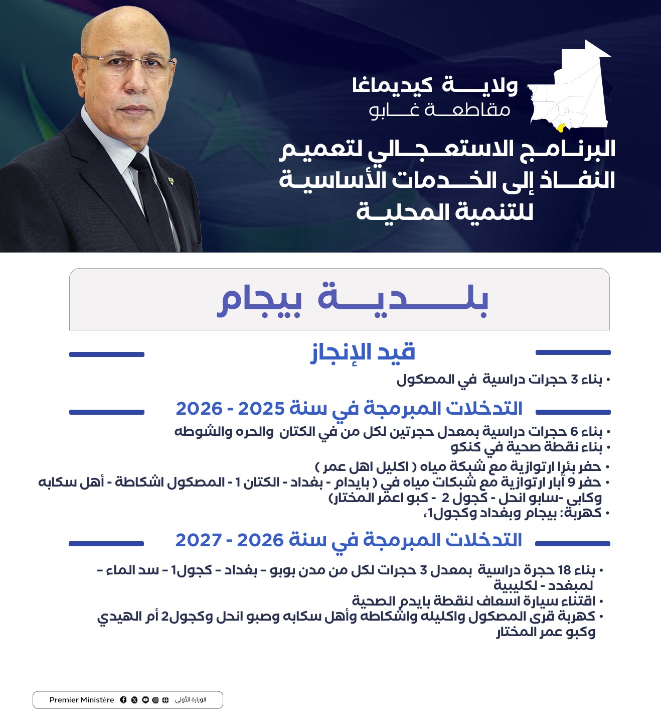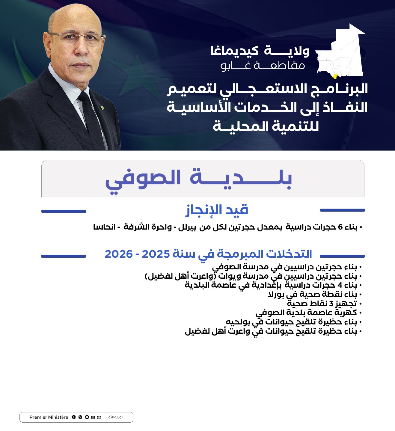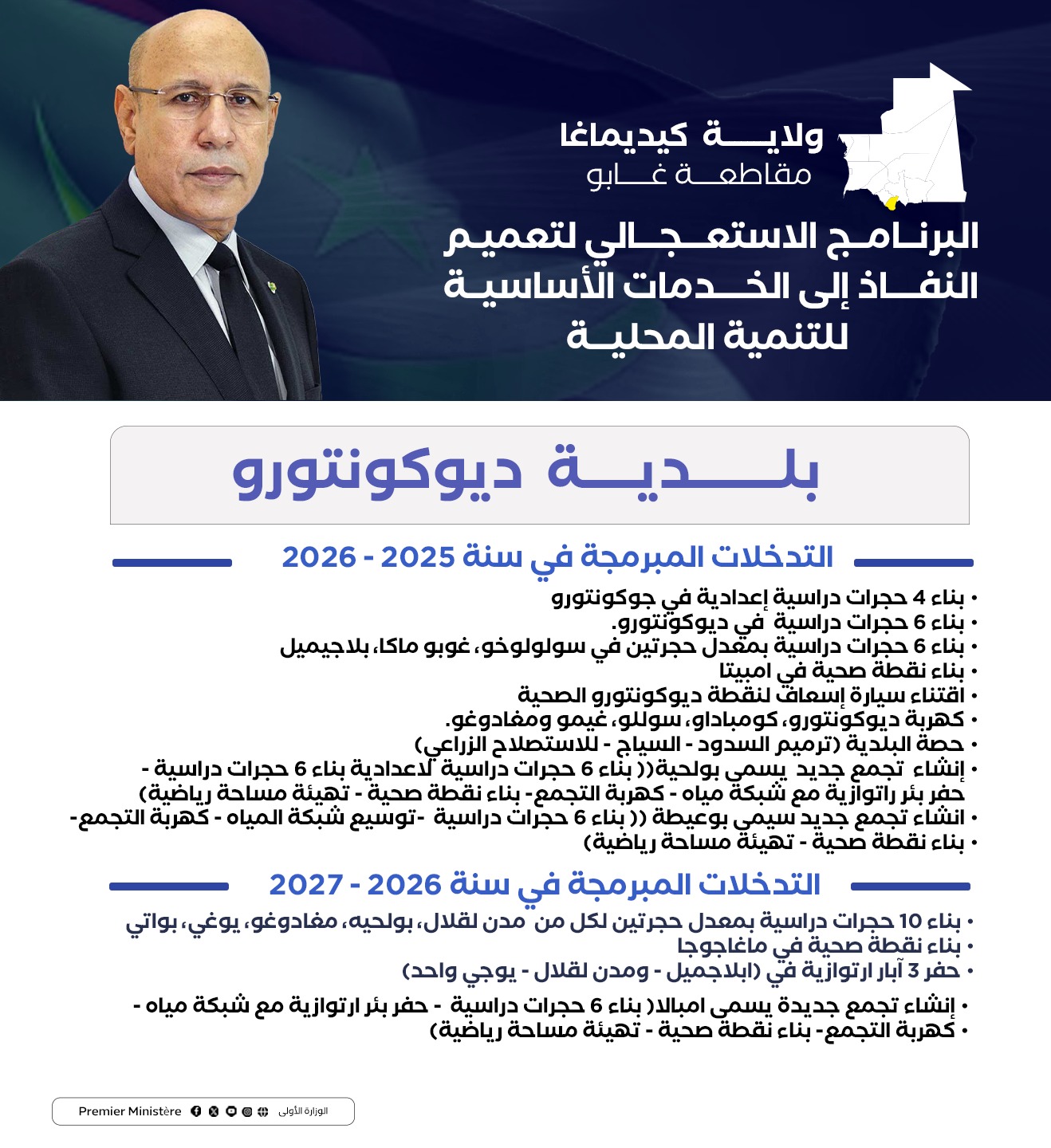 استعرضت البعثة الوزارية إلى ولاية كيديماغا برئاسة المندوب العام للتضامن الوطني ومكافحة الاقصاء “تآزر” السيد الشيخ ولد بده، في اجتماع الأحد بمدينة سيلبابي، التدخلات التي تم اعتمادها في الولاية ضمن البرنامج الاستعجالي لتعميم النفاذ إلى الخدمات الضرورية للتنمية المحلية، بناء على النقاشات التي جرت في المنتديات الجهوية للتخطيط التنموي التشاركي في شهر يناير الماضي.