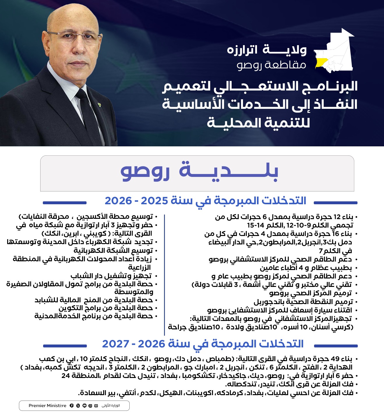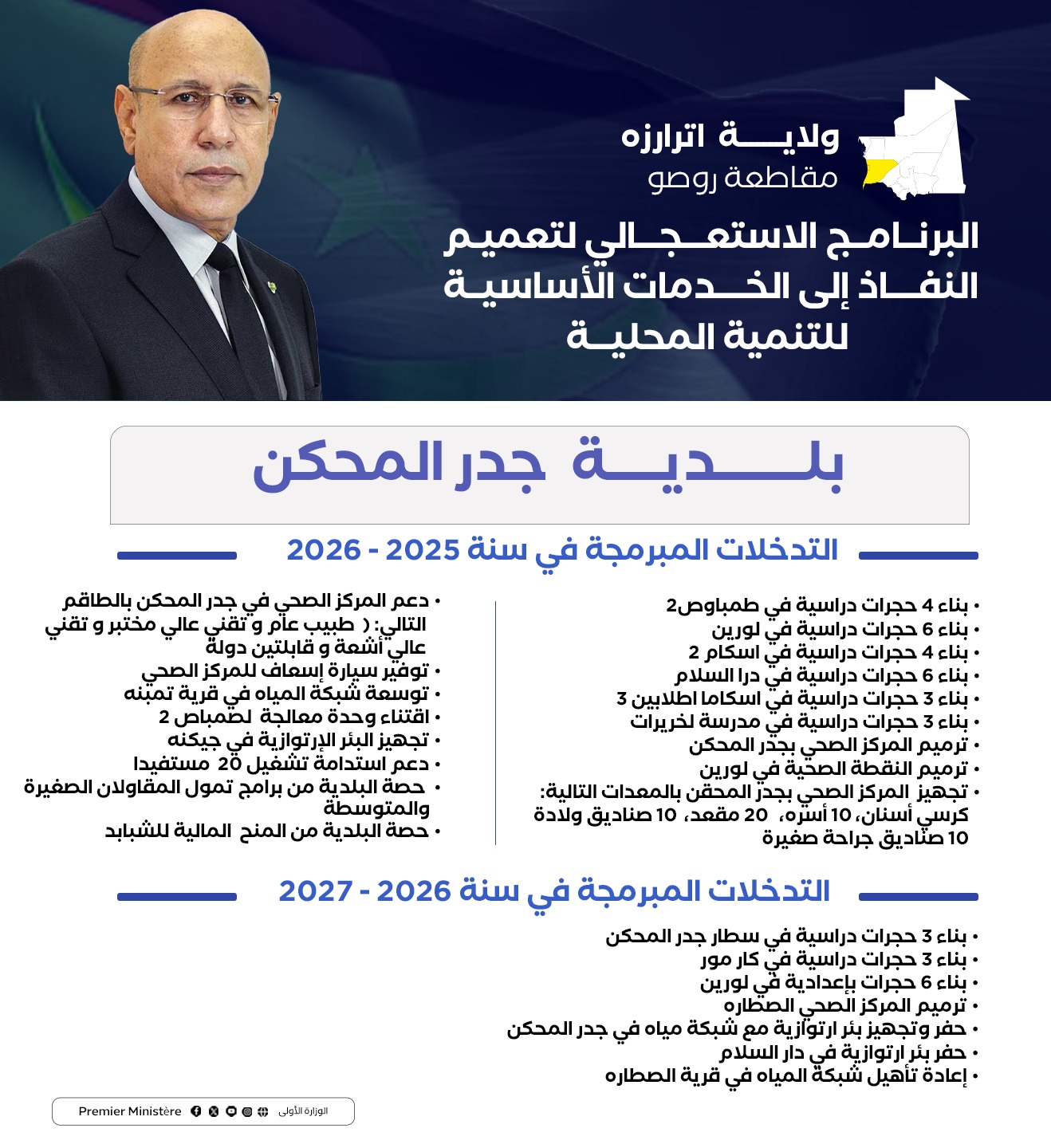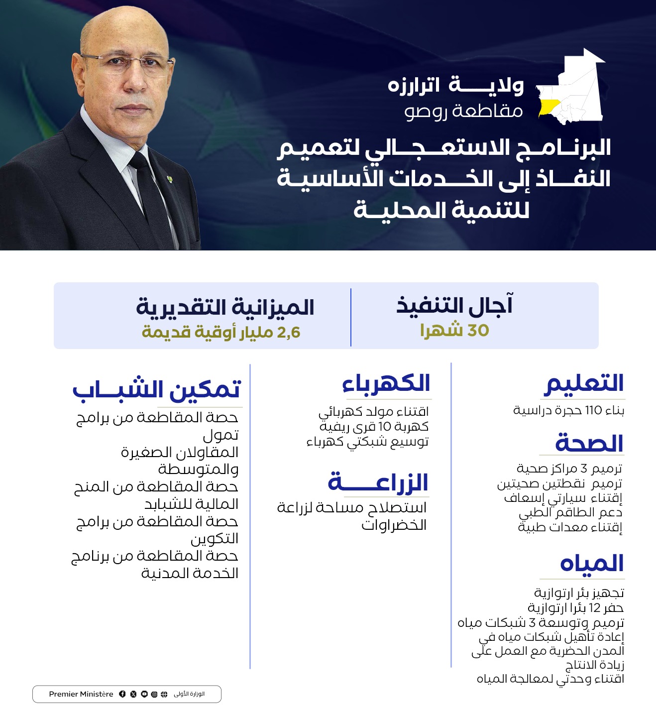 أطلقت السلطات برنامجا استعجاليا لتعميم النفاذ إلى الخدمات الأساسية في ولاية اترارزة، وذلك في إطار خطة وطنية تهدف إلى تعزيز التنمية المحلية وتحسين الظروف المعيشية للسكان.