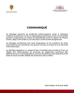 أعربت جمهورية السنغال، عن قلقها “العميق إزاء الهجوم العسكري الإسرائيلي على جمهورية إيران الإسلامية والتصعيد الذي أثاره”.