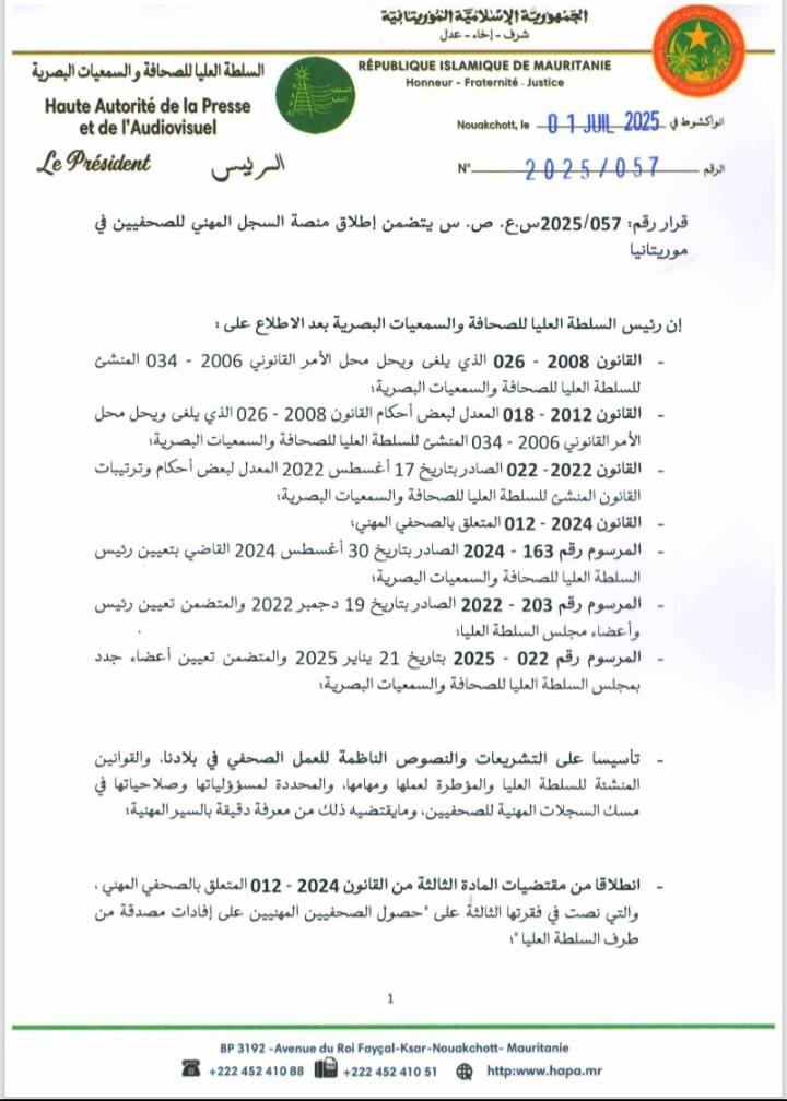 أعلنت السلطة العليا للصحافة والسمعيات البصرية (HAPA) مساء اليوم الثلاثاء عن قرار بشأن إنشاء منصة السجل المهني للصحفيين في موريتانيا، طبقا لنص البيان التالي: