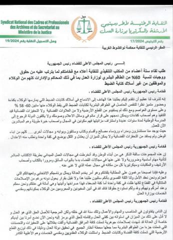 طالبت النقابة الوطنية لأطر ومهنيي الارشفة والسكريتريا لوزارة العدل بإنصاف منتسبيها.