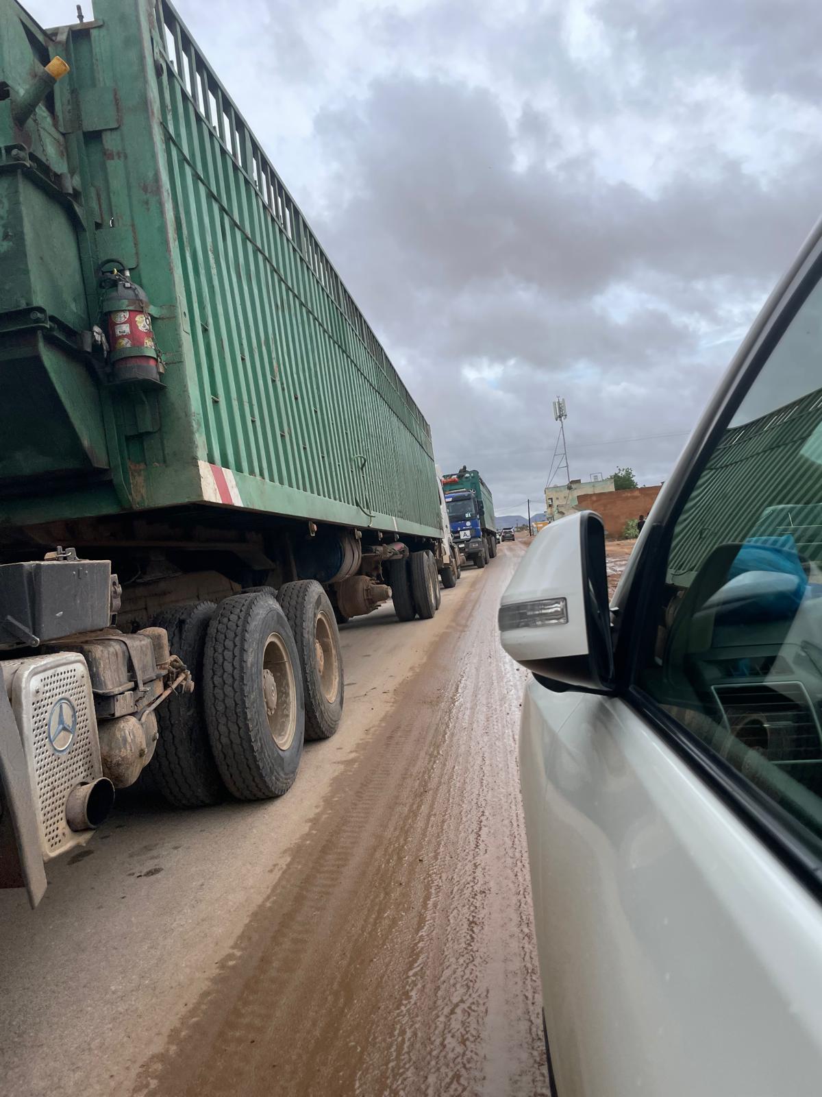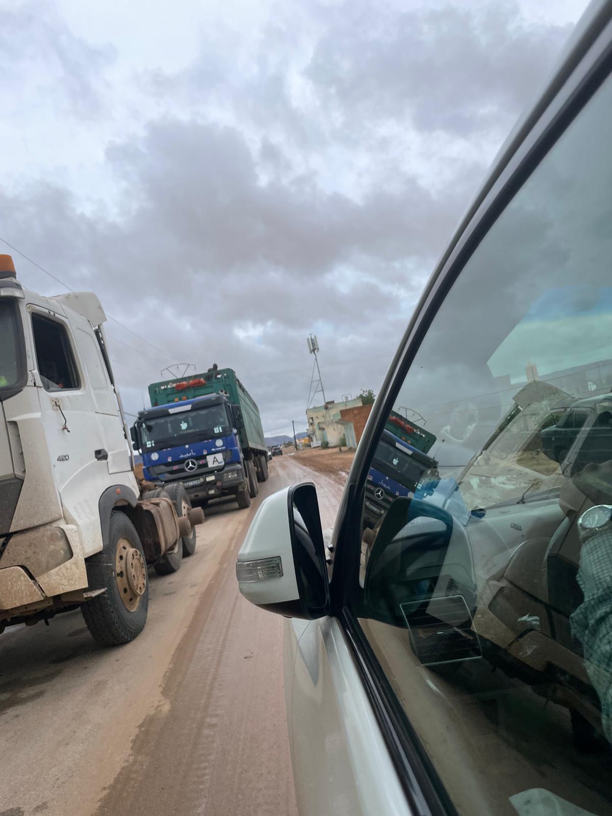 وتظهر صور حصلت عليها وكالة لبجاوي أنفو العديد من السيارات والشاحنات المتوقفة على الطريق في انتظار حل لمشكل الجسرين الذين تعثر المرور عبرهما جراء السيول الناتجة عن الأمطار.
