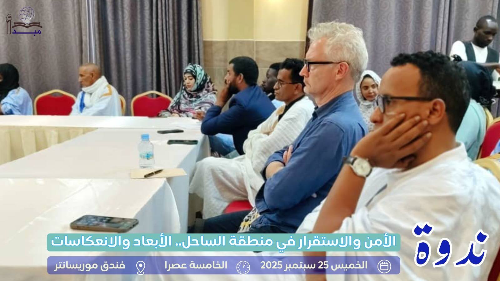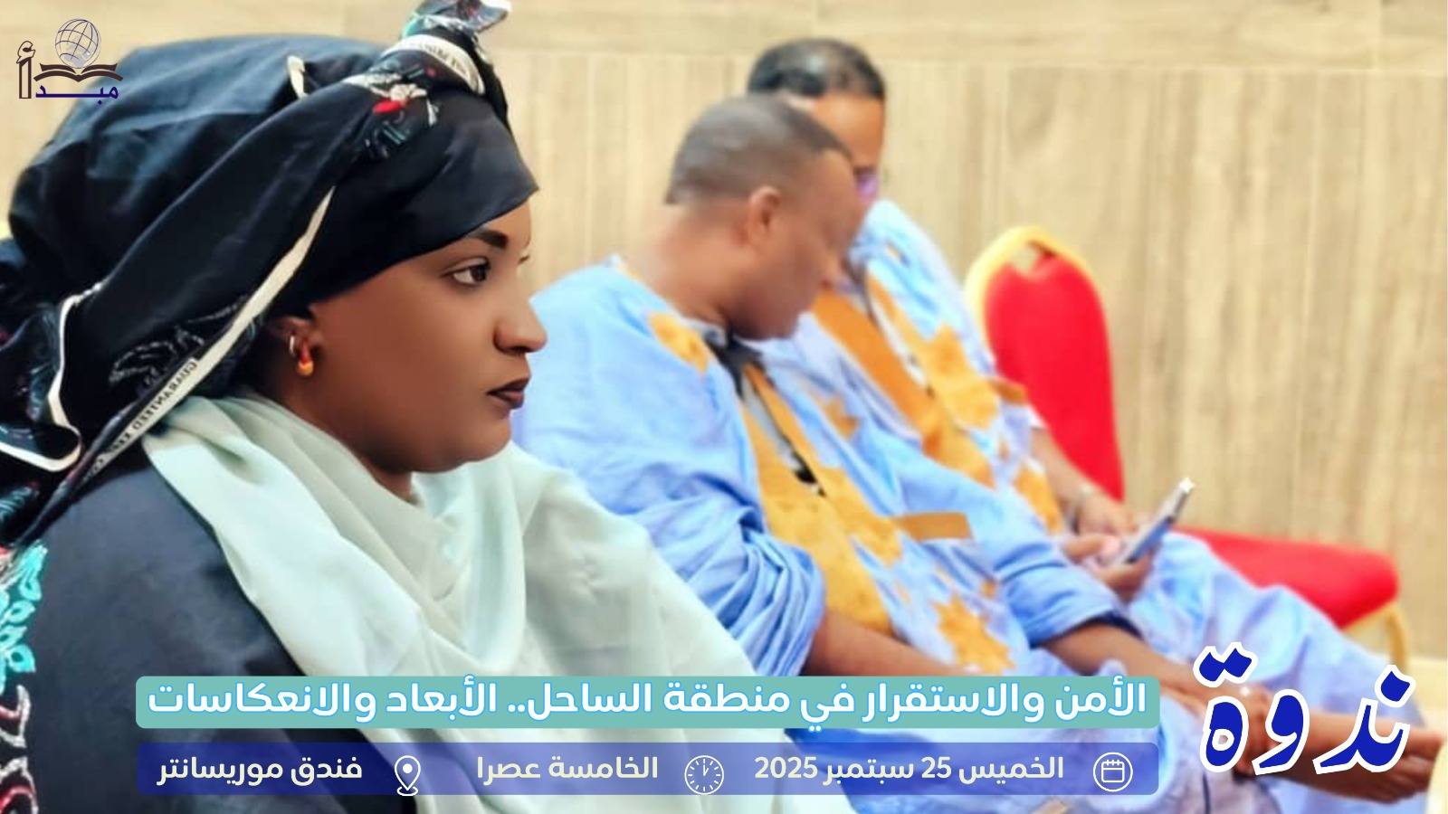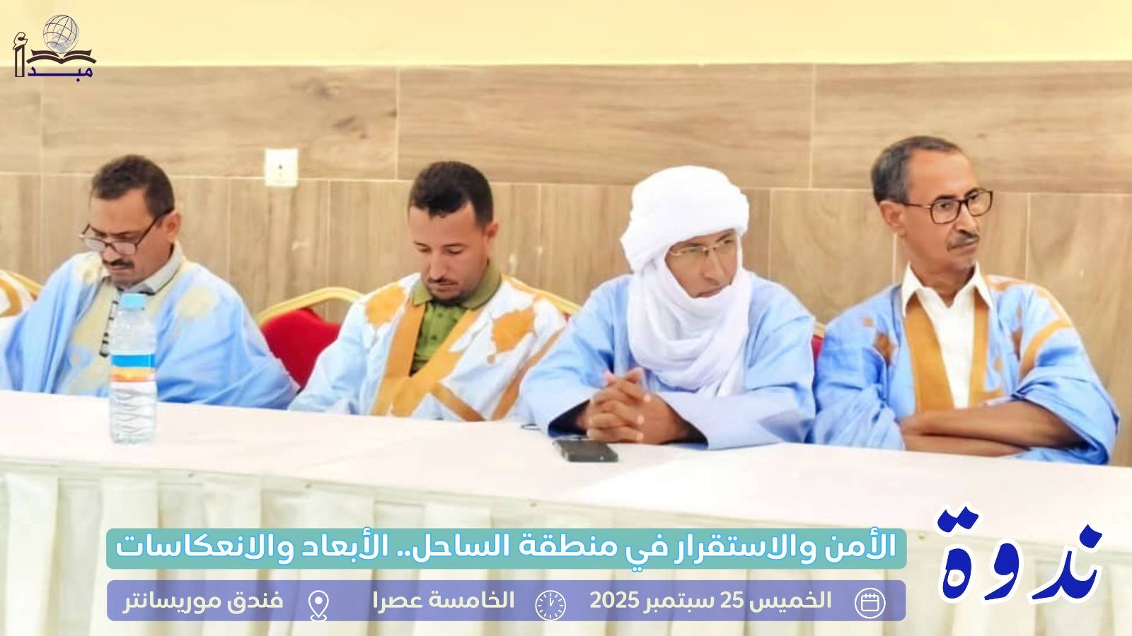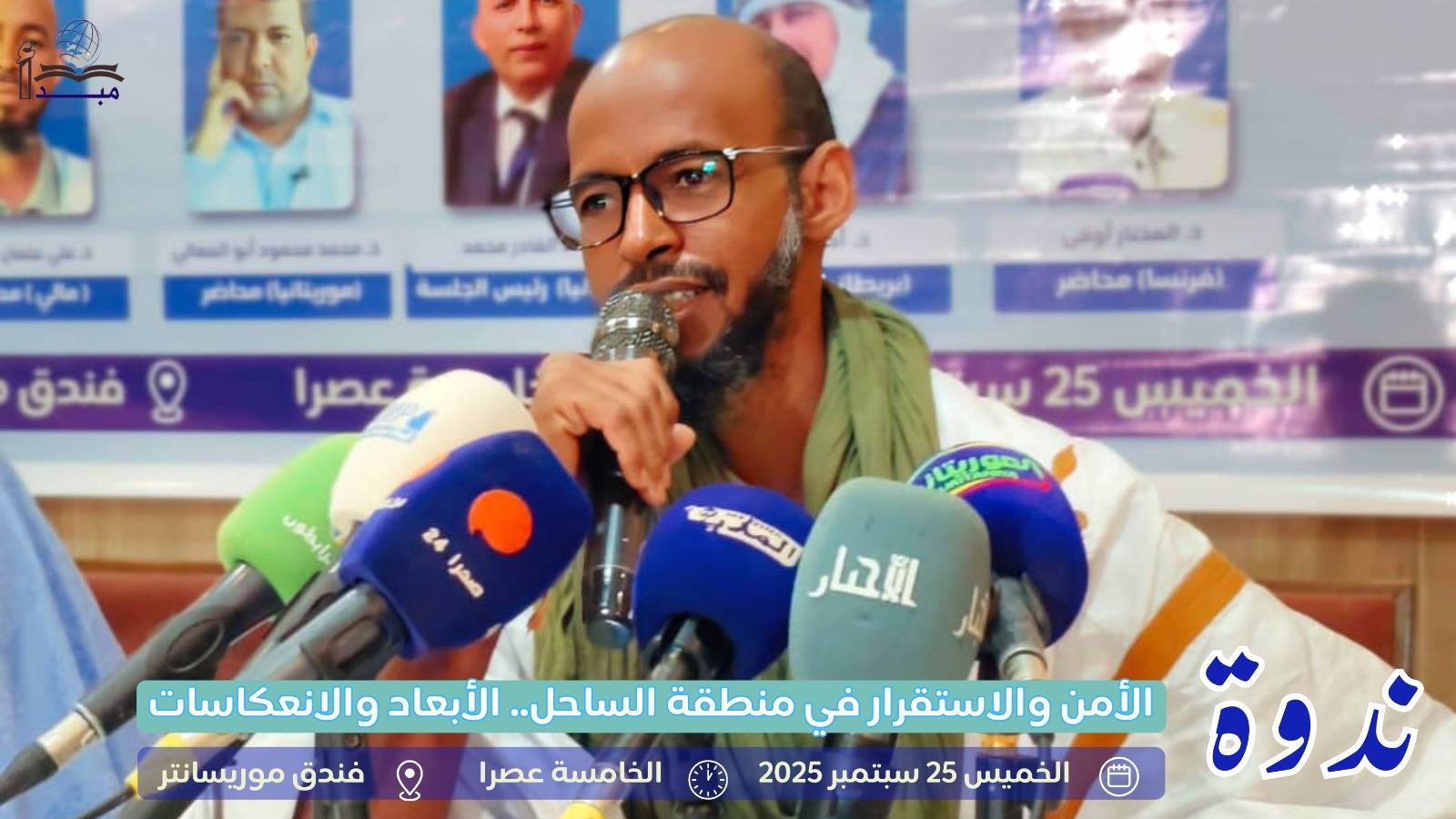 نظم المركز الموريتاني للبحوث والدراسات الإنسانية (مبدأ) مساء الخميس 25 سبتمبر 2025، ندوة دولية بعنوان “الأمن والاستقرار في منطقة الساحل.. الأبعاد والانعكاسات”، وذلك بفندق موريصانتر بنواكشوط.