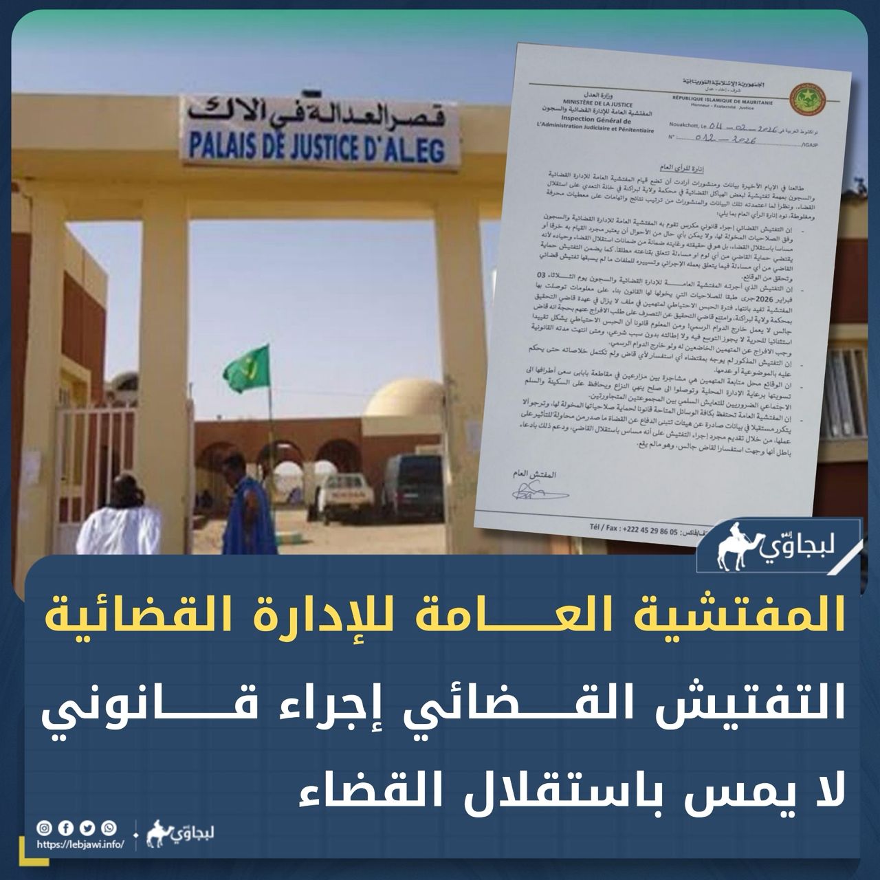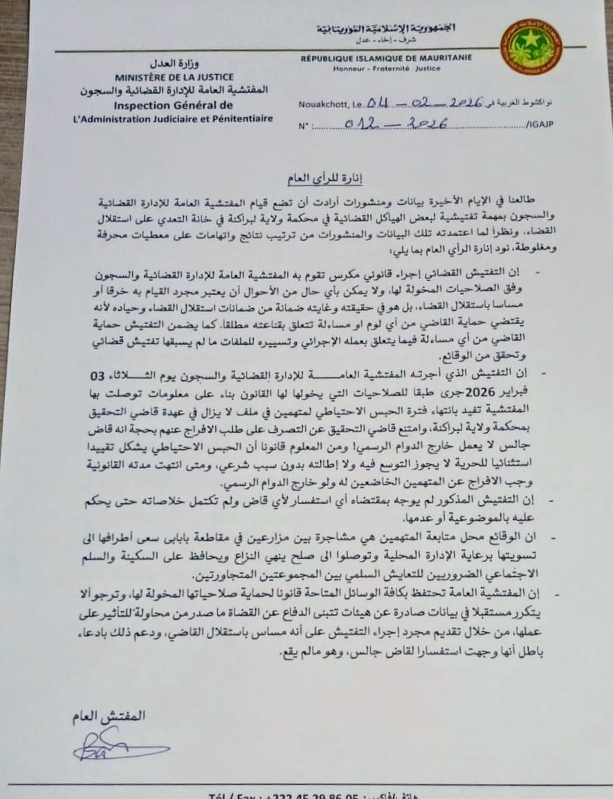 طالعنا في الإيام الأخيرة بيانات ومنشورات أرادت أن تضع قيام المفتشية العامة للإدارة القضائية والسجون بمهمة تفتيشية لبعض الهياكل القضائية في محكمة ولاية لبراكنة في خانة التعدي على استقلال القضاء. ونظراً لما اعتمدته تلك البيانات والمنشورات من ترتيب نتائج واتهامات على معطيات محرفة ومغلوطة، نود إنارة الرأي العام بما يلي: