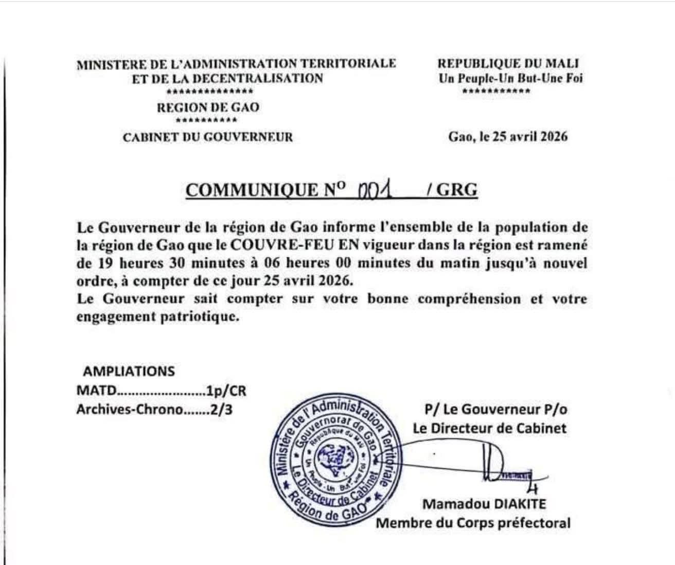 كما قرر حاكم مدينة غاو تعديل توقيت حظر التجول ليبدأ من السابعة والنصف مساءً إلى السادسة صباحًا، وذلك ابتداءً من اليوم وحتى إشعار آخر، وسط تشديد أمني في عدد من المناطق