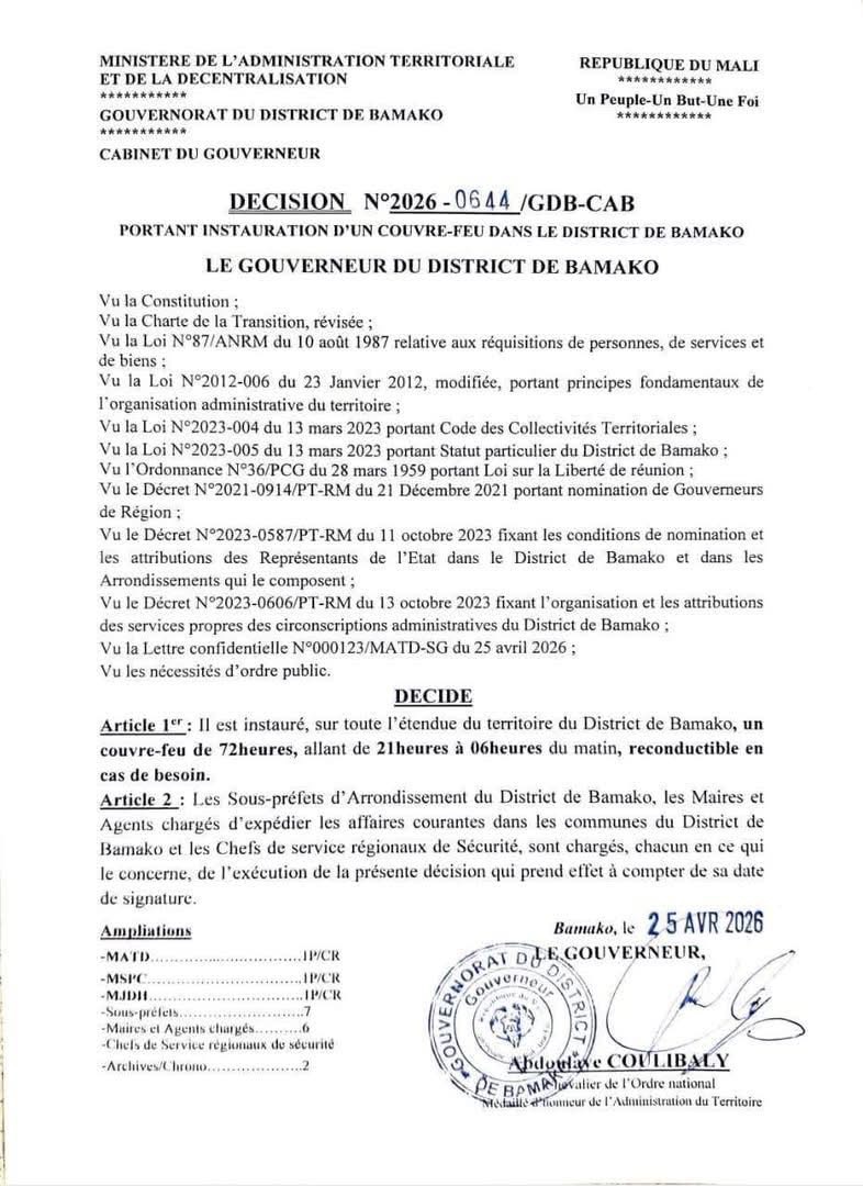 أعلنت السلطات في مالي فرض حظر تجول في العاصمة باماكو لمدة 72 ساعة قابلة للتجديد عند الحاجة، ابتداءً من مساء اليوم وحتى ساعات الصباح الأولى، في إطار إجراءات أمنية استثنائية.