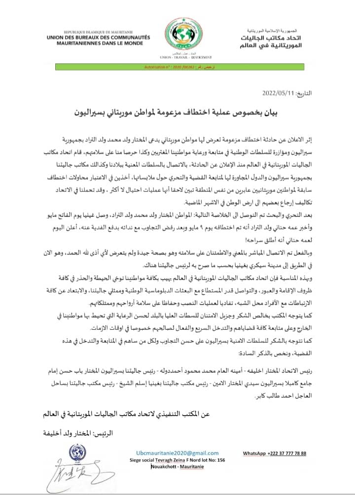 أعلن اتحاد مكاتب الجاليات الموريتانية فى العالم ،أن المواطن الموريتاني المختار ولد محمد الذي تم اختطافه فى سيراليون يوم 9 مايو أطلق اليوم سراحه بعد أن علم مختطفيه رفض أسرته التجاوب معهم فى دفع فدية مقابل إطلاق سراحه