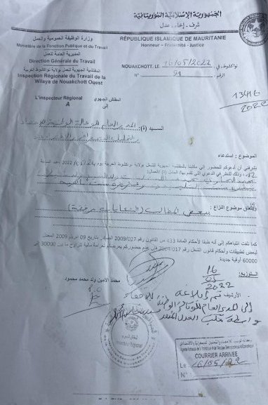 وحسب وثيقة نسبت للمفتشية فإن المدير العام لوكالة الإحصاء مطلوب للحضور يوم غد 24-05-2022 عند الساعة 12:00 " تحت طائلة الغرامة المالية حال الغياب بمبلغ يتراوح بين 30 إلى 60 ألف أوقية جديدة".