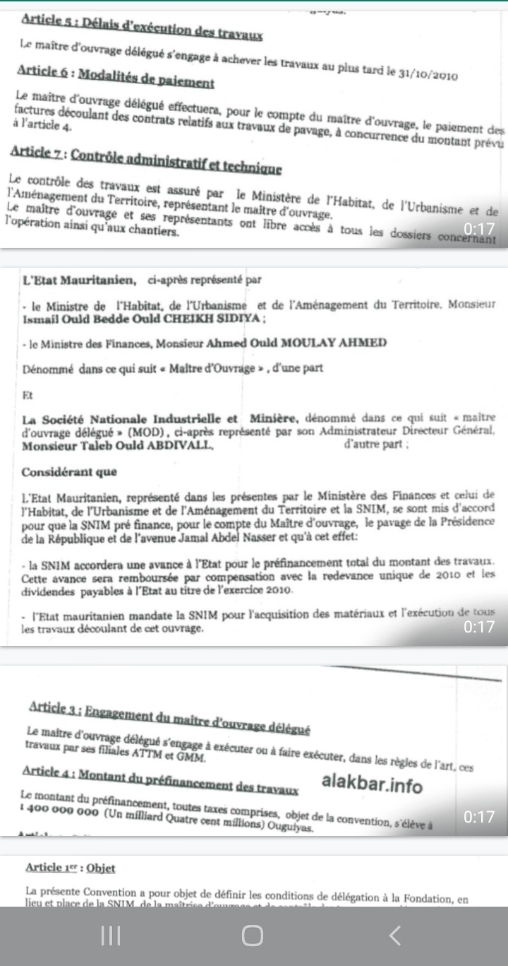 ما أدلى به الوزير الناطق باسم الحكومة فيما يتعلق بموضوع الأشغال التي قامت بها شركة آتتم في منتجع 70 كلم علي طريق اكجوجت كمرفق تابع لرئاسة الجمهورية و معلن في مذكرة التفاهم بين الدولة ممثله من طرف وزارة الاسكان و وزارة الماليه من جهة و شركة اسنيم من جهة أخري (مقتطفات مرفوقه) تنقصه الدقة، وربما يعود ذلك إلى عدم فهم السؤال الذي طرح، ذلك أن الأشغال التي قيم بها ليست من مزانية شركة اسنيم كما ادعى الوزير وإنما من اموال الدولة الموريتانية الموجودة لدى الشركة كمستحقات ضريبية علي الأخيرة و بتفويض منها كرب عمل لشركة اسنيم مفوض، و نوعية الأشغال منصوص عليها في الاتفاقيات في فترة المدير العام للشركة آنذاك الطالب ولد عبدي فال.