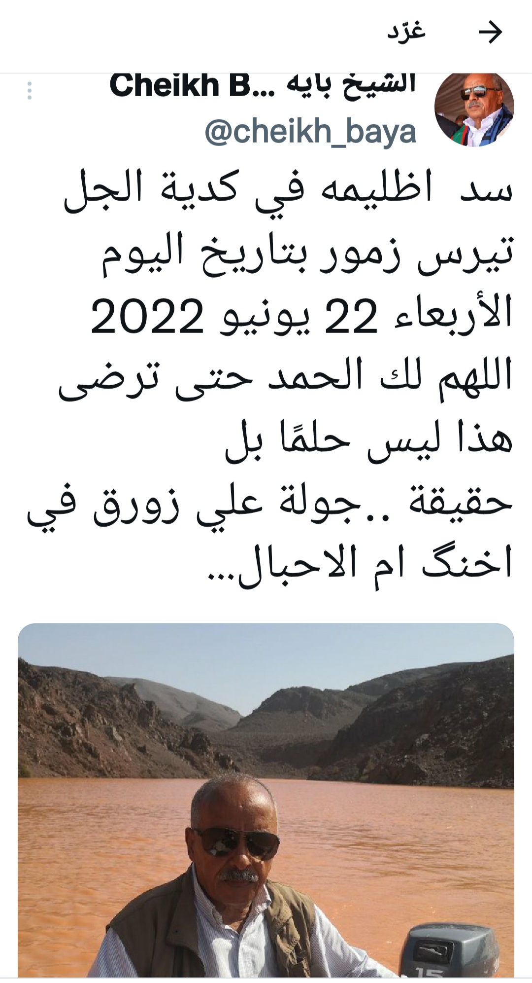 ونشر ولد بايه الصورة على حسابه على تويتر موضحا من خلالها أن ذلك "ليس حلمًا بل حقيقة ، جولة علي زورق في اخنگ ام الاحبال"