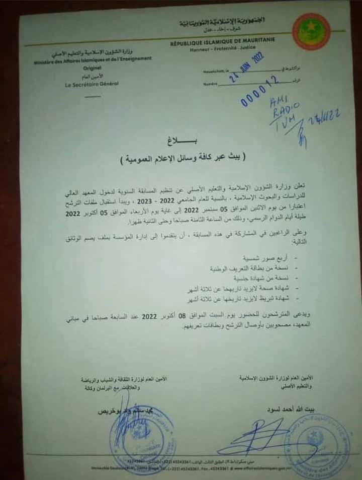 أعلنت وزارة الشؤون الإسلامية والتعليم الأصلي عزمها تنظيم المسابقة السنوية لدخول المعهد العالي للدراسات والبحوث الإسلامية ، بالنسبة للعام الجامعي 2022 – 2023 ،.