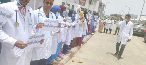 نظم عمال الصحة بمستشفى الشيخ زايد اليوم الإثنين وقفة احتجاجية تضامنا مع زميلهم الدكتور "لحبوس ولد الطاهر" بعد تعرضه لإعتداء جسدي ولفظى من طرف أحد المواطنين