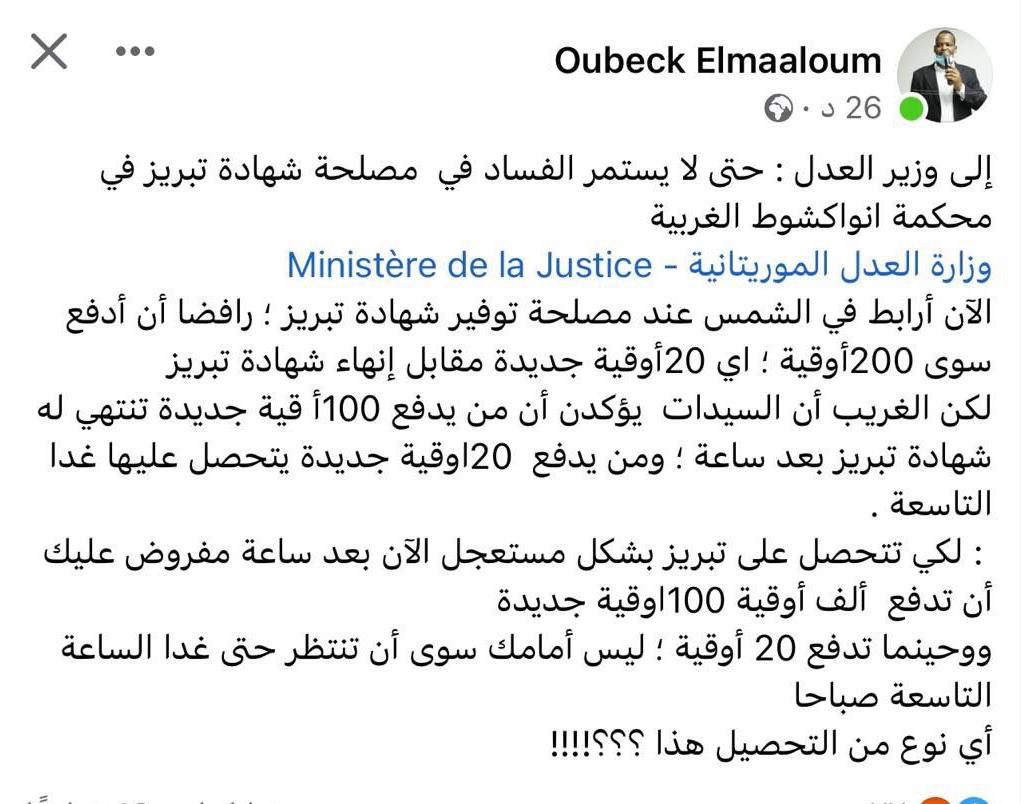 وبدأ التحقيق في الموضوع عقب تدوينة للأستاذ والمدون المعلوم ولد أوبك حول عرضهن عليه تسريع إجراءات الحصول على شهادة تبريز مقابل دفع 1000 أوقية بدل 20 أوقية قديمة.