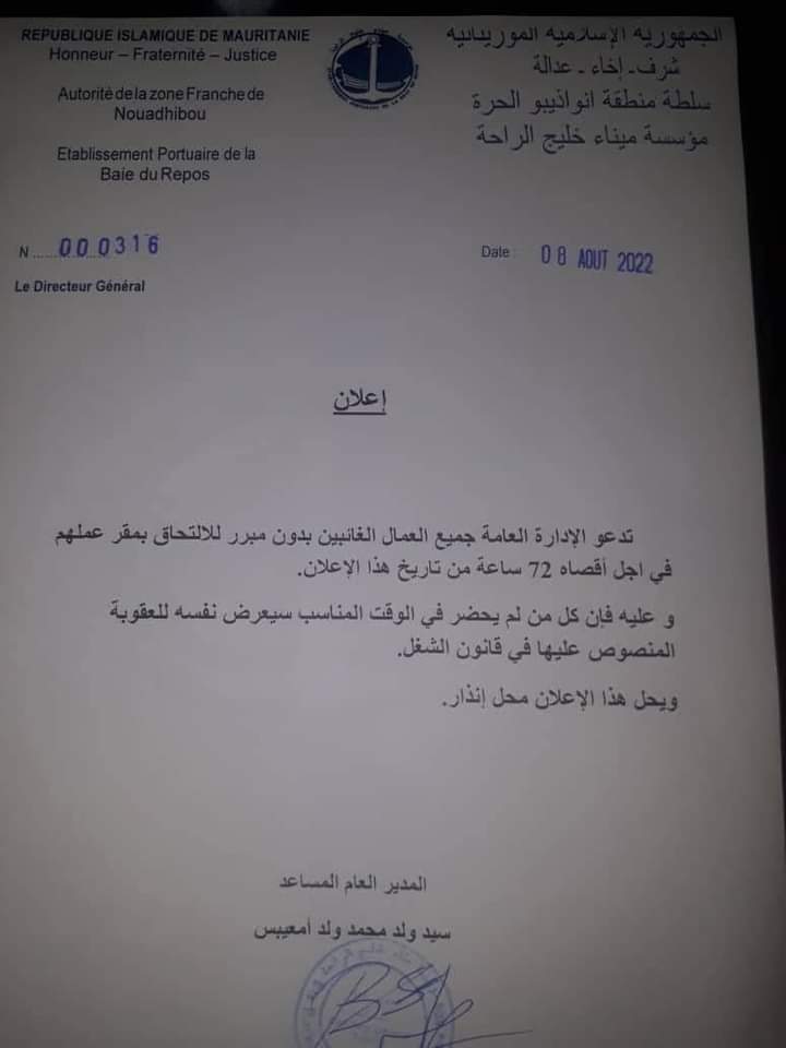 نواذيبو : إدارة ميناء خليج الراحة تصدر تحذيرا للعمال الغائبين عن عملهم بدون مبرر