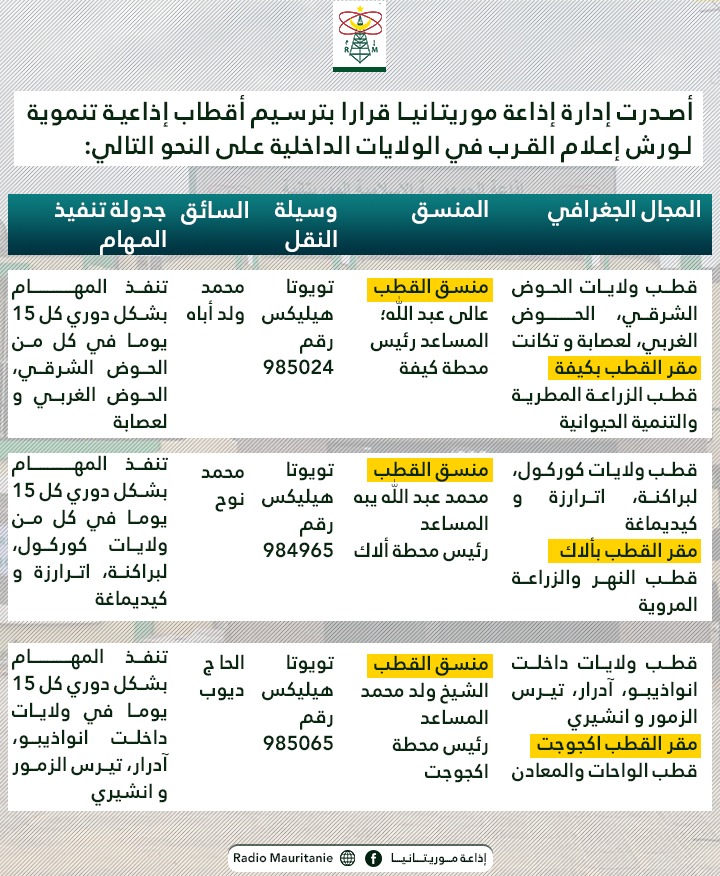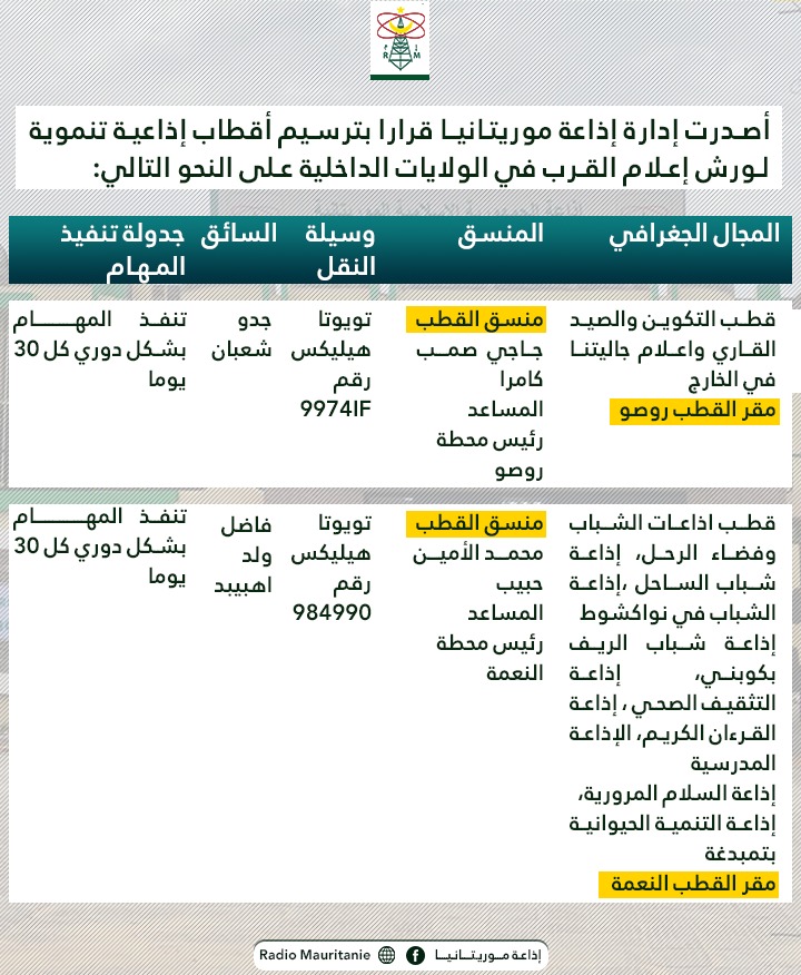 تدعيما لورش اعلام القرب ، التي تجوب ثمان بعثات إذاعية الآن في جميع ولايات الوطن ل15لإجراء مسح شامل عن الحملة الزراعية المطرية والمروية في تلك الربوع، أصدر المدير العام لإذاعة موريتانيا السيد محمد الشيخ ولد سيد محمد ، اليوم الخميس1سبتمبر2022 ،