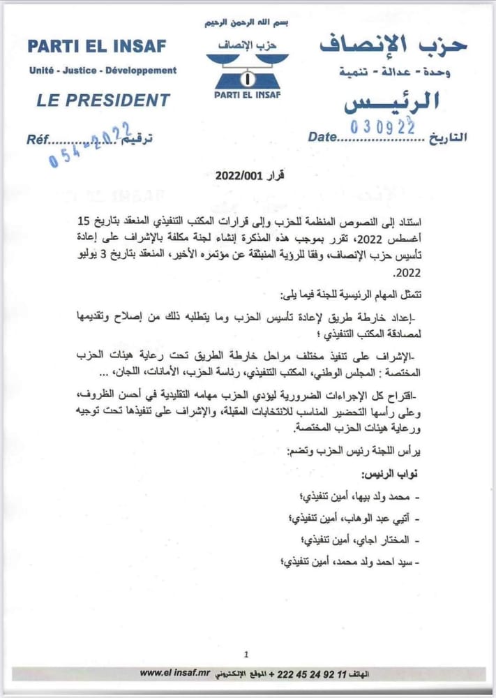 أصدر رئيس حزب "الإنصاف" الحاكم بموريتانيا محمد ماء العينين ولد أييه اليوم السبت مذكرة بتعين لجنة مكلفة بالإشراف على إعادة تأسيس الحزب.