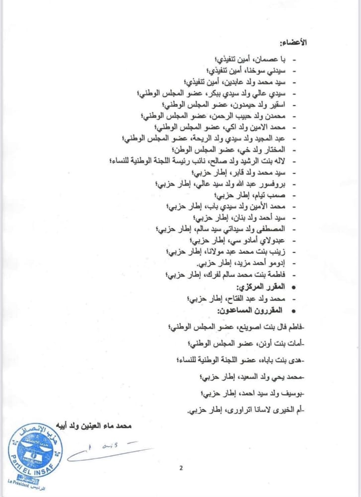 ويرأس اللجنة رئيس الحزب محمد ماء العينين ولد أييه، فيما تضم أربعة نواب للرئيس هم: محمد ولد بيها، آتيي عبد الوهاب، المختار اجاي، سيد احمد ولد محمد.